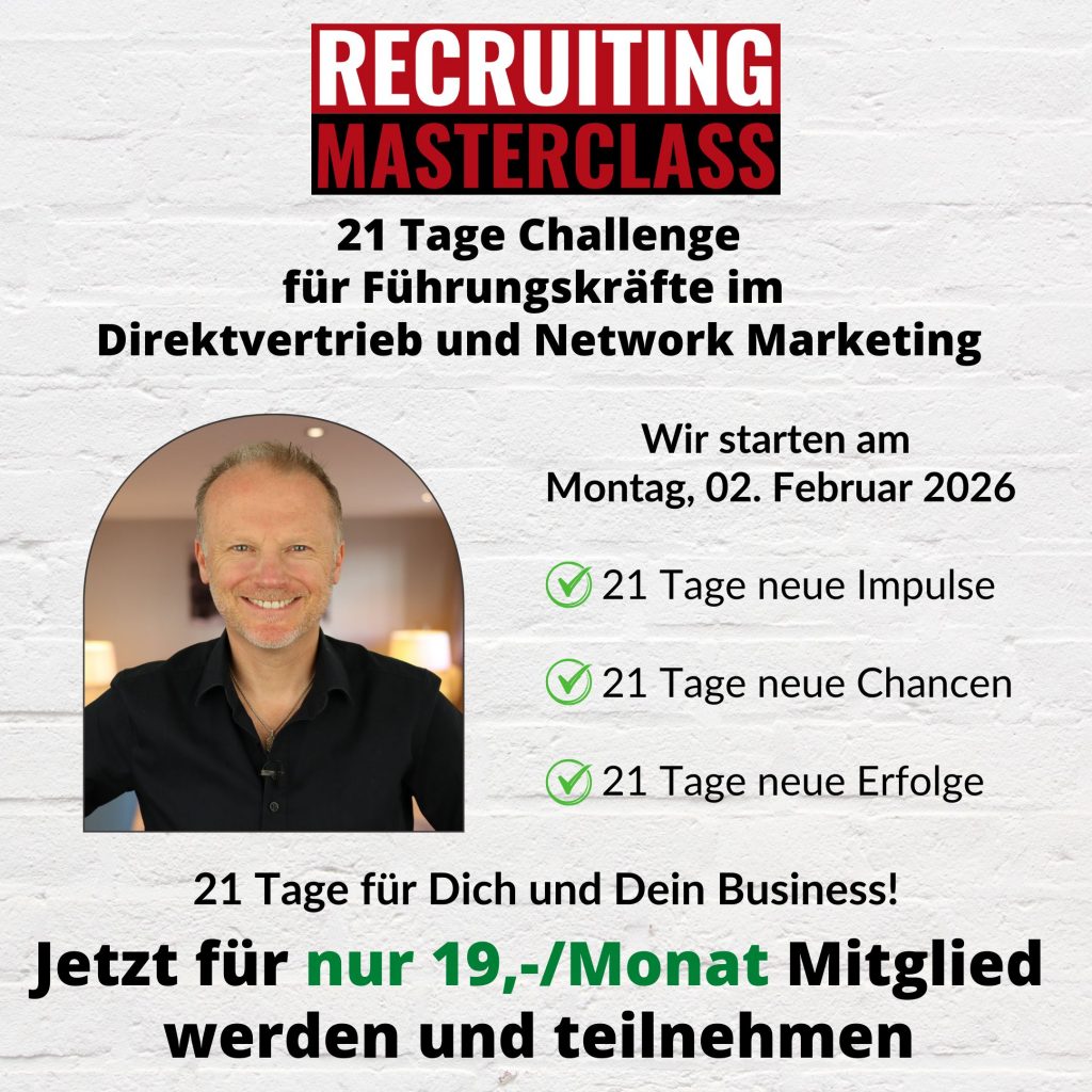 Die 21 Tage Challenge „Recruiting Masterclass“ ist eine Möglichkeit für Dich, dass Du Dich 21 Tage lang ununterbrochen voll und ganz auf Dein Business und das Wachstum Deines Vertriebsteams konzentrierst. Mit dem glasklaren Ziel, anderen Menschen eine gewinnbringende Tätigkeit zu vermitteln, hilfst Du im ersten Schritt anderen Menschen dabei, ihr Leben positiv zu verändern. Im zweiten Schritt wirst Du selbst dadurch erfolgreicher und kommst Deinen eigenen Zielen immer näher.