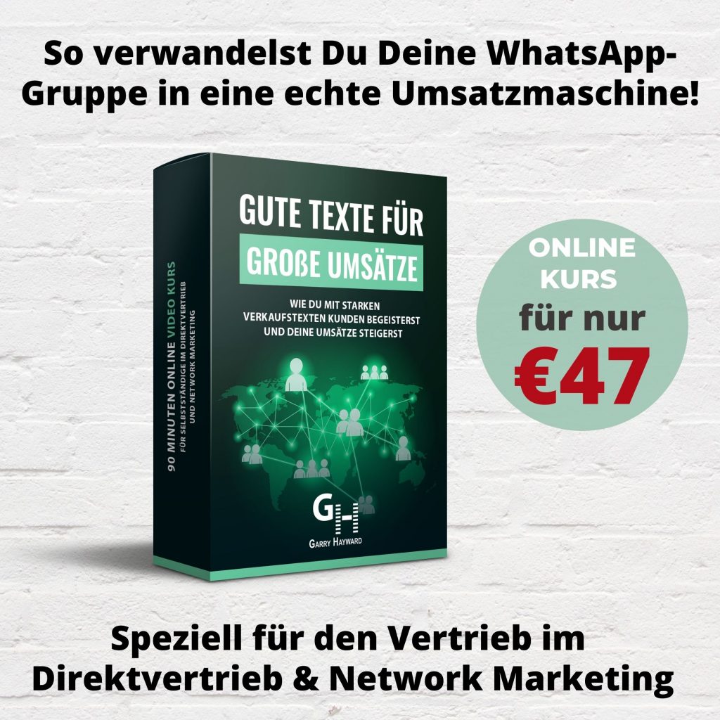Mit dem Online-Video-Kurs „Gute Texte für große Umsätze“ lernst Du, wie Du über die Vorteile Deines Produktes schreibst (oder sprichst, wenn Du z.B. Videos verwendest), um verkaufsfördernde Emotionen bei Deinen Gästen zu wecken. Durch den Einsatz von geschicktem Storytelling und den Fokus auf die Vorteile deines Produktes erhöhst Du massiv die Kaufquote in Deinen WhatsApp-Gruppen.